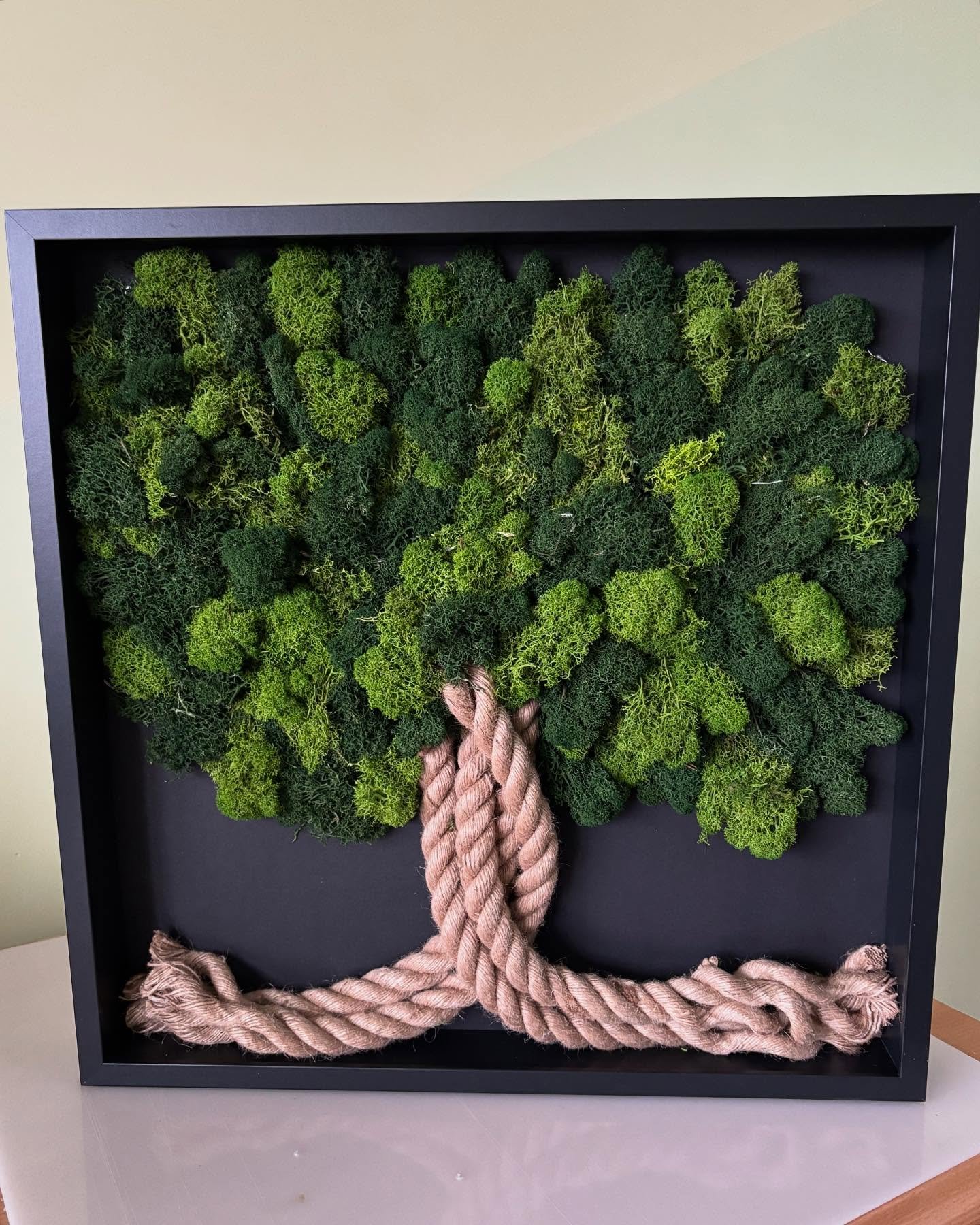 Rankų darbo. iš stabilizuotų samanų ir virvės. Gamyboje naudojami klijai ir popierius.