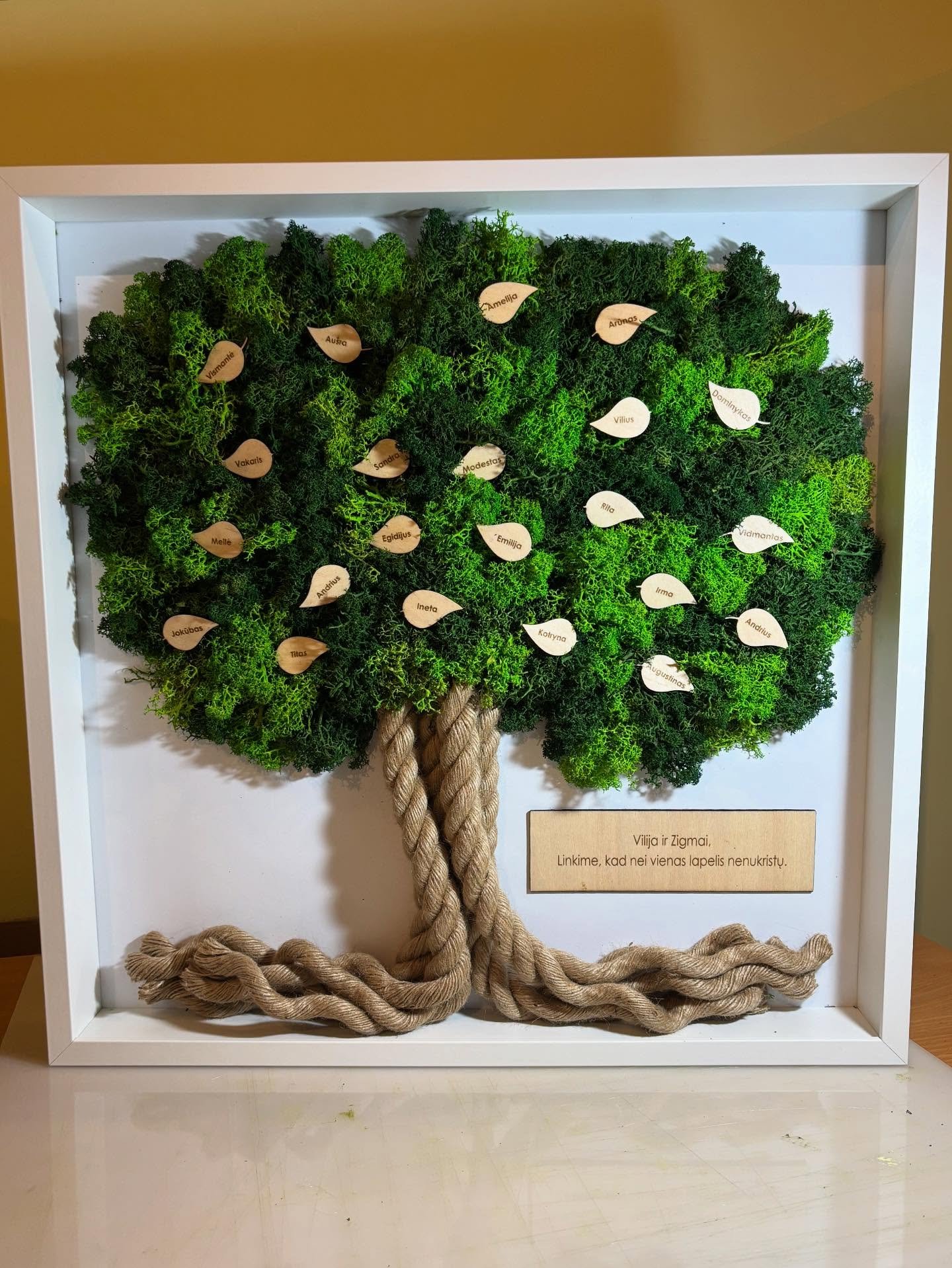 Mediniai lapeliai, skirti papuošti samanų medžius. Puikiai tiks priminti ir įamžinti šeimos istoriją, pasveikinti mokytoją ar auklėtoją.