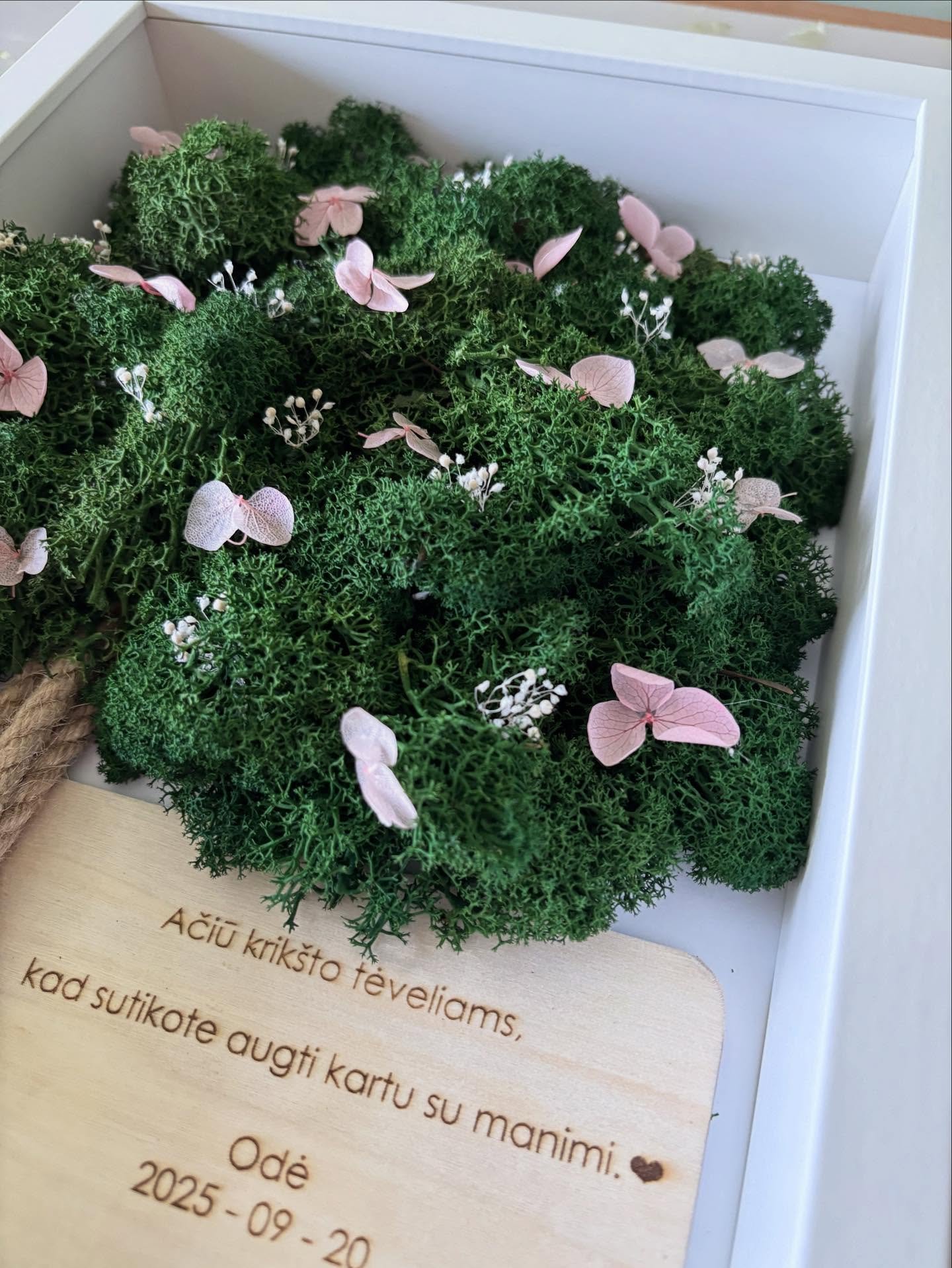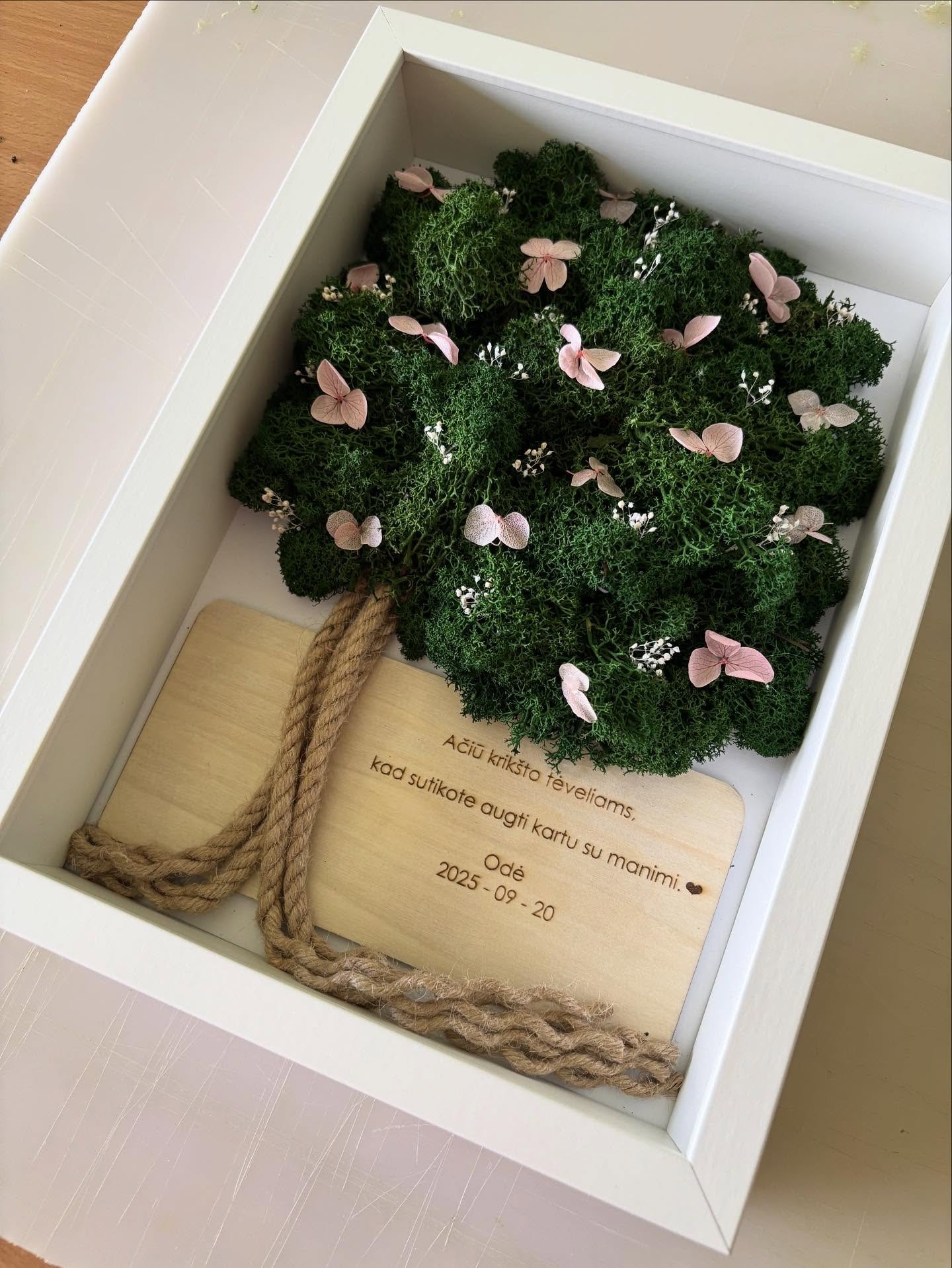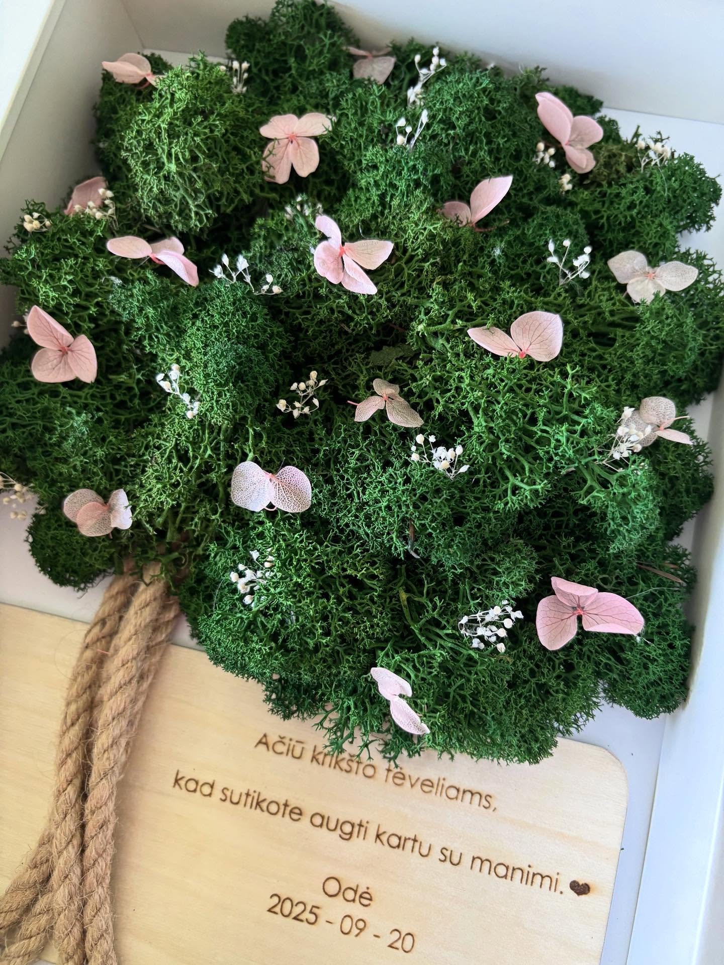 Rankų darbo medelis iš stabilizuotų samanų ir virvės.